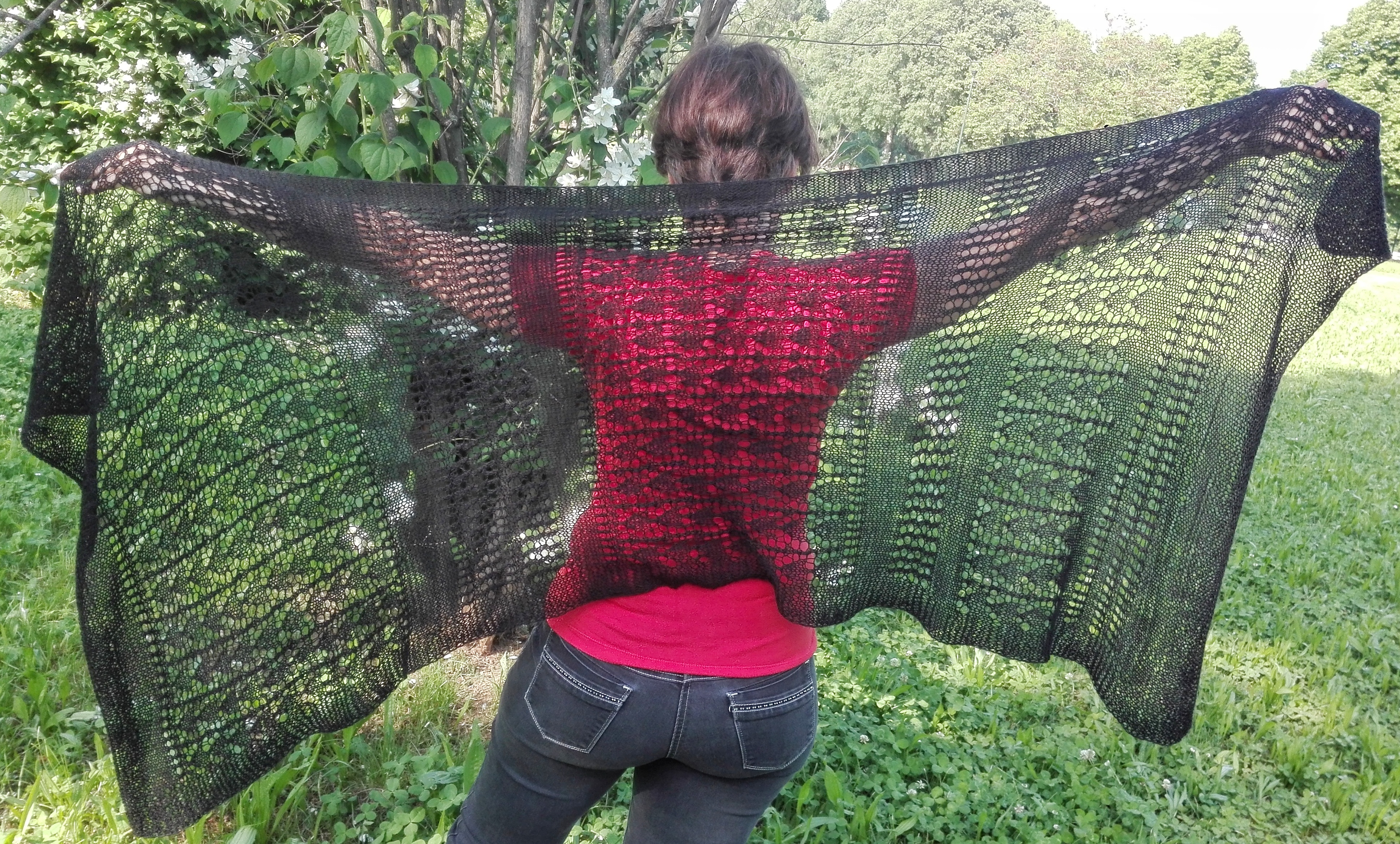 Ho usato un filato fingering e le dimensioni sono cm 150 di lunghezza e cm 60 di larghezza, ma si può realizzare con qualsiasi tipo di filato, io ad esempio ho seguito queste istruzioni anche per Ida’s Sugar Lace, realizzata in un filato tipo aran in alpaca e ho ottenuto queste dimensioni: lunghezza cm 170 e larghezza cm 45.