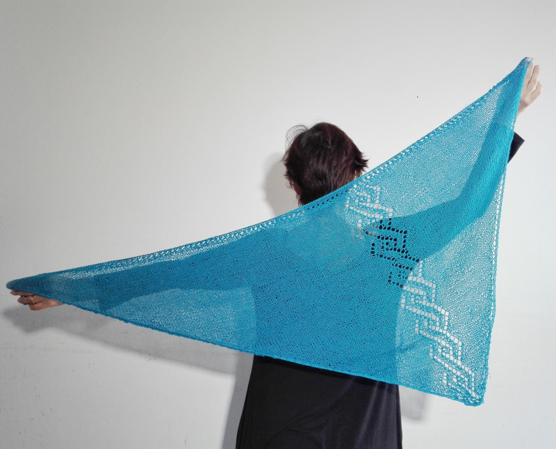 Con una punta molto allungata. Questa è la mia forma di scialle preferita in assoluto perché è di facile costruzione e quando si indossa sulle spalle la punta non si allunga sulla schiena, ma la attraversa diagonalmente creando un effetto inaspettato. Quando lo si avvolge intorno al collo come se fosse una sciarpa un lato è più lungo dell’altro e anche questa asimmetria la trovo interessante e un po’ sbarazzina. Si lavora dal basso verso l’alto aumentando una volta sempre sul dritto del lavoro.