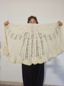 Cominciamo da questo scialle a mezzaluna realizzato in alpaca artigianale.