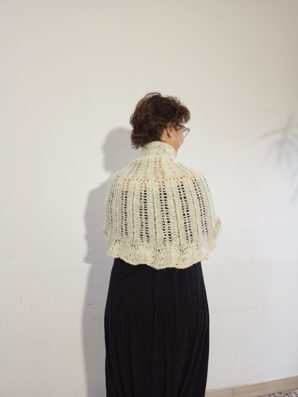 Il filato è stato filato a mano e la sua consistenza irregolare ha inciso anche sulla forma dello scialle rendendolo un perfetto scaldacollo oltre che coprispalle!